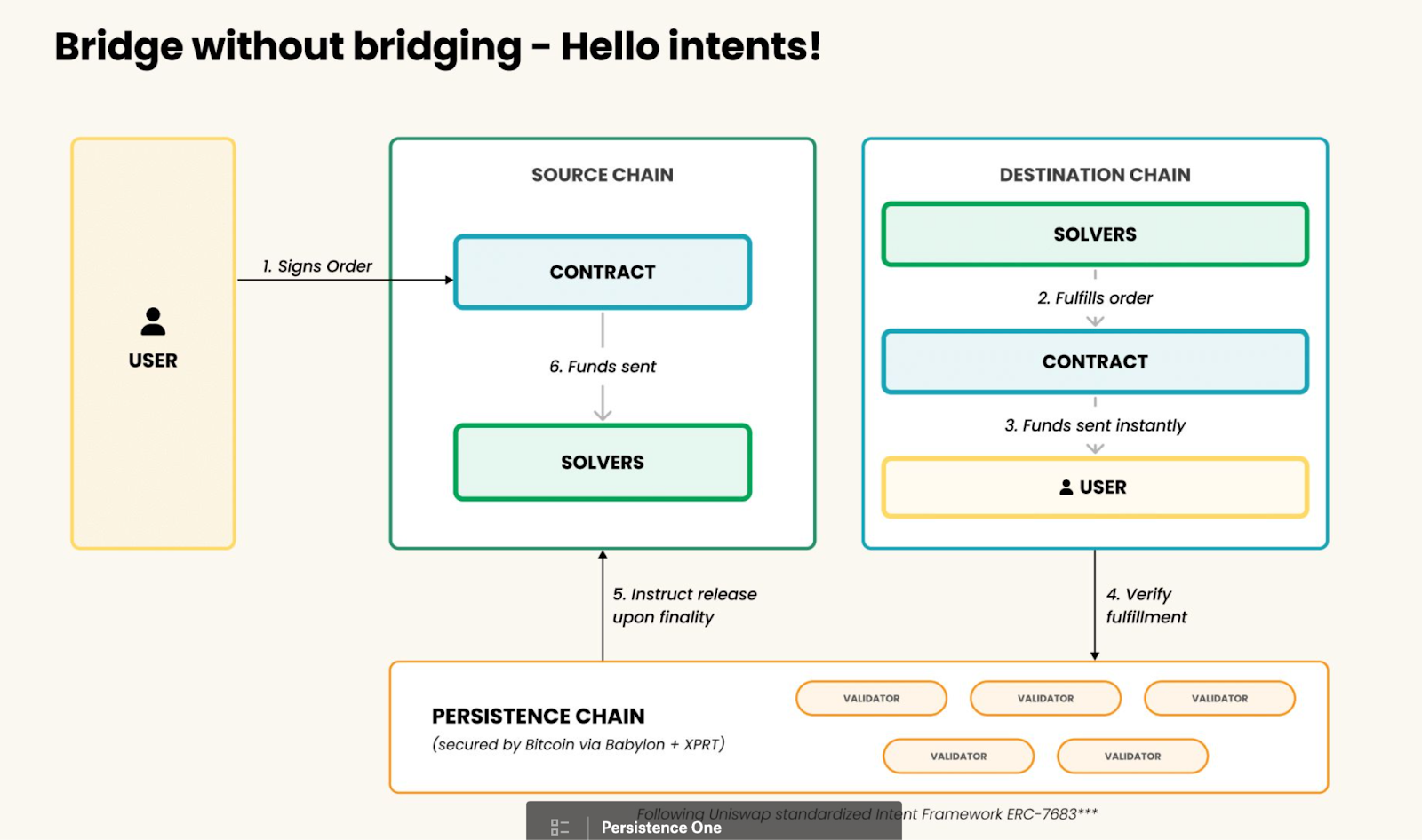 • Persistence One’s integration with LayerZero ensures real-time communication between the source and destination chains, allowing for quick confirmations and funds are released to the solvers on the source chain.